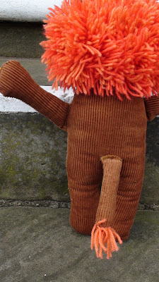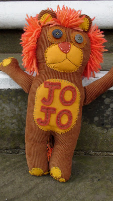 Here is a new custom doll, Jojo's Lion. Made from corduroy, felt and yarn. He is 14 inches tall and has arms that like to dance and give hugs. Going to his new home just in time for Christmas.