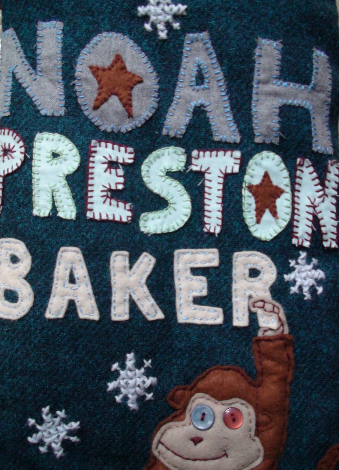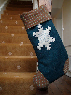 Here is what I have been working on this week. A custom stocking for a little boy in Canada. It is lined with wadding and soft polka dot fabric- lovely and soft for little hands to dive into. Complete with monkey applique and personal embroidered message on the reverse. Almost complete... Just needs the top stitching and a hook. Final pictures to come.