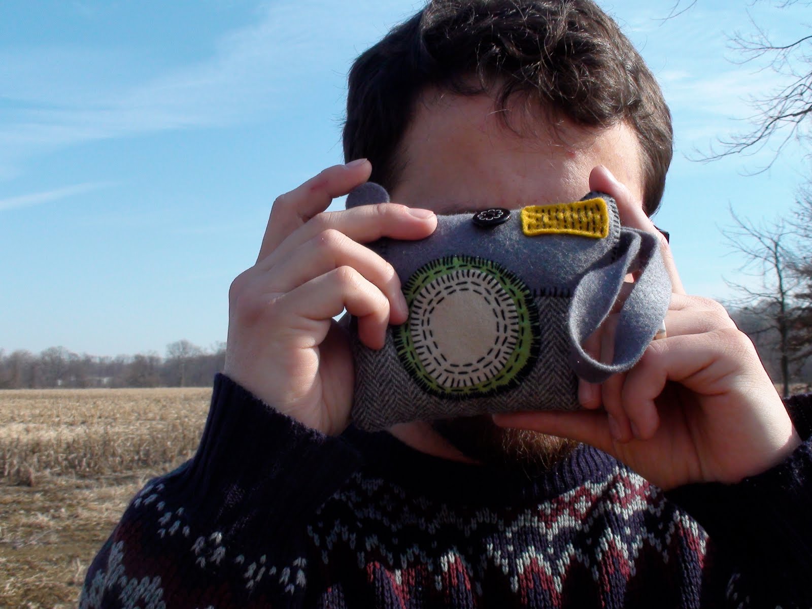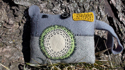 Here is a plush camera I made one afternoon last month. I love the Wintery-Spring Indiana background. Made from felt, vintage buttons and a lovely herringbone weave. Kindly modelled by my hubby Andy J. Miller.