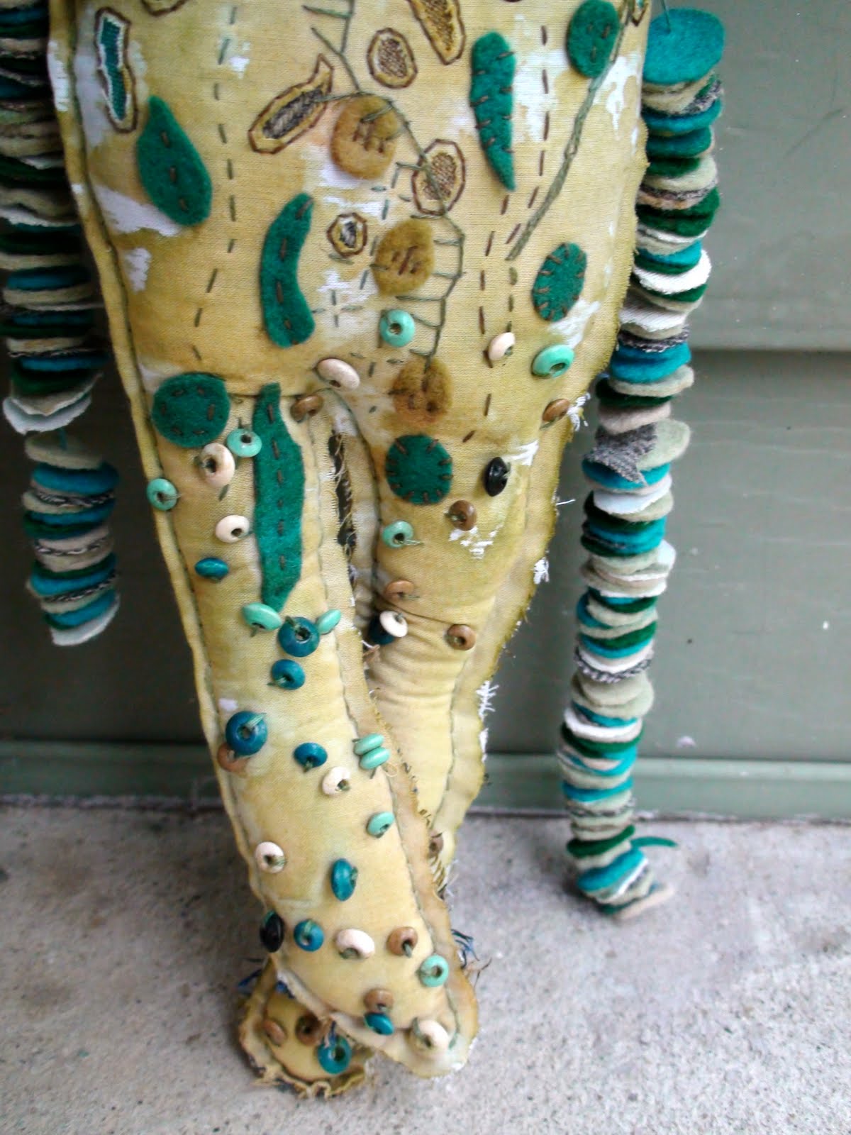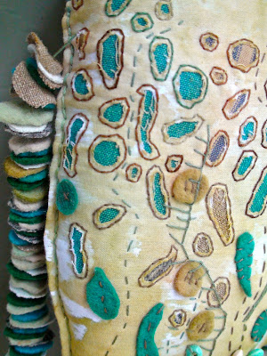 Here is 'Lady River' she is inspired by the Earth's water. Her crown is made from shell which I sourced when sketching at a local creek. Hand dyed with cold water dyes and tea. Hand stitched and embellished with wooden beads.